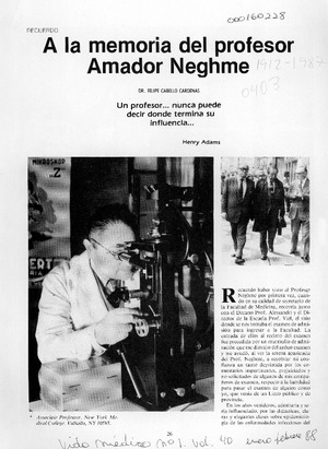 A la memoria del profesor Amador Neghme [artículo] / Felipe Cabello Cárdenas. Vida Médica. -- Vol. 40, no. 1 (ene. feb. 1988) p. 26-27 retr. .