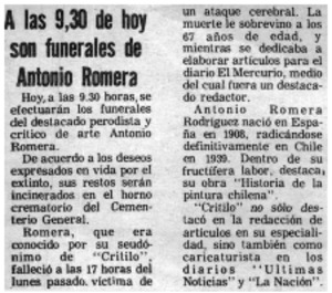 A las 9.30 de hoy son funerales de Antonio Romera. [artículo] La Tercera (Diario : Santiago, Chile)-- jun. 25, 1975, p. 15. .