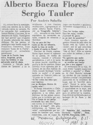 Alberto Baeza Flores / Sergio Tauler [artículo] / Andrés Sabella. El Mercurio (Diario : Antofagasta, Chile)-- feb. 8, 1981, p. 3. .