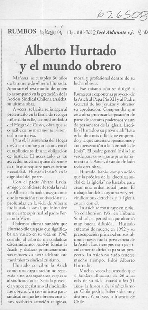 Alberto Hurtado y el mundo obrero [artículo] José Aldunate La Nación (Santiago) ago. 17, 2002, p. 10 .