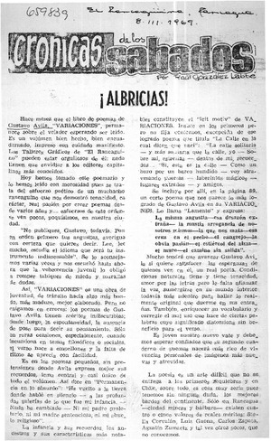 ¡Albricias! [artículo] / Raúl González Labbe. El Rancagüino (Rancagua, Chile)-- mar. 8, 1969. .