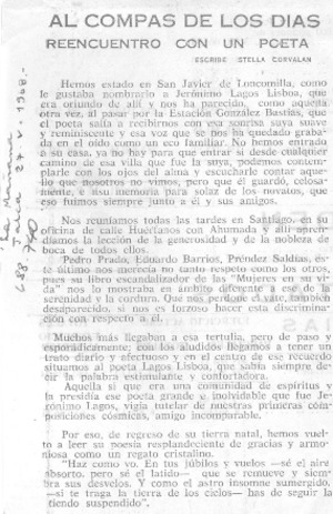 Al compás de los días [artículo] / Stella Corvalán. La Mañana (Talca, Chile)-- mayo 27, 1968. .