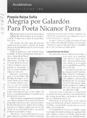 Alegría por galardón para poeta Nicanor Parra [artículo] Proyección UBB no. 116 (jun. 2001) P. 10 il. .