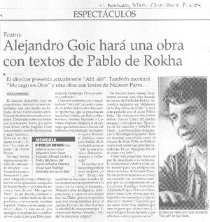 Alejandro Goic hará una obra con textos de Pablo de Rokha [artículo] / Verónica Marinao El Mercurio (Diario : Santiago, Chile) oct. 23, 2004, p. C24. .