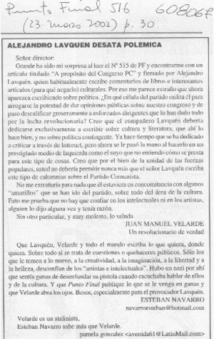 Alejandro Lavquen desata polémica [artículo] Punto Final (Santiago) no. 516 (mar. 23, 2002) p. 30 .
