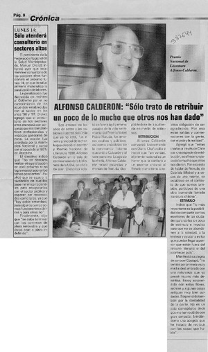 Alfonso Calderón, "Sólo trato de retribuir un poco de lo mucho que otros nos han dado" [artículo] Chañarcillo dic. 11, 1998, p. 8 retr. .