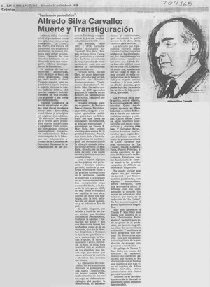Alfredo Silva Carvallo, muerte y transfiguración. [artículo] Las Últimas Noticias (Diario : Santiago, Chile)-- oct. 24, 1979, p. 2. .