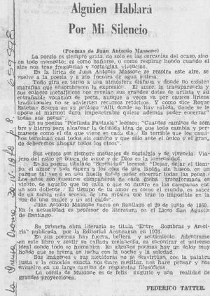 Alguien hablará por mi silencio [artículo] / Federico Tatter. La Prensa (Osorno, Chile)-- abr. 30, 1979, p. 8. .