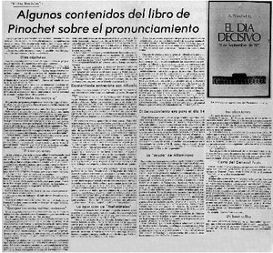 Algunos contenidos del libro de Pinochet sobre el pronunciamiento. [artículo] El Mercurio (Diario : Santiago, Chile)-- dic. 20, 1979, p. 8. il. .