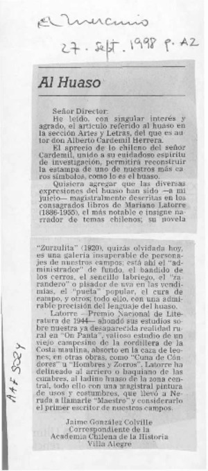 Al huaso [artículo] / Jaime González Colville. El Mercurio (Santiago). -- sept. 27, 1998, p. A2 .