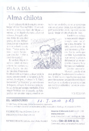 Alma chilota [artículo] / Mentessana. El Mercurio (Diario : Santiago, Chile)-- ene. 11, 2010, p. A3. .