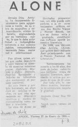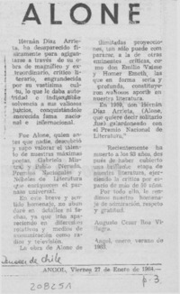 Alone [artículo] / Augusto César Roa Villagra. Renacer de Chile. -- ene. 27, 1984, p. 3. .