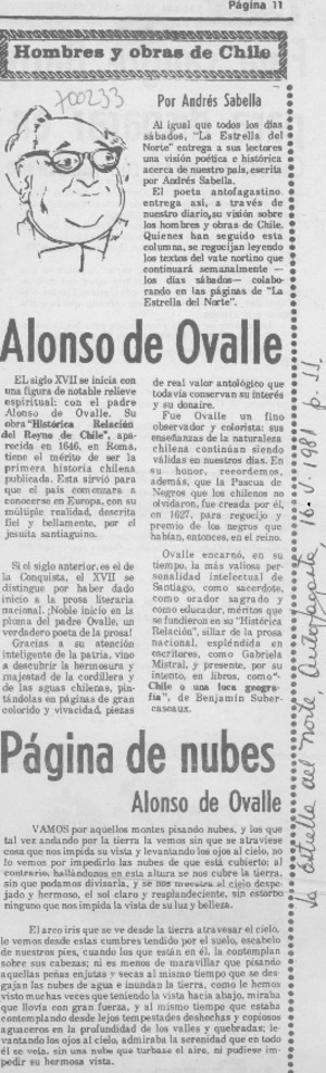 Alonso de Ovalle [artículo] / Andrés Sabella. La Estrella del Norte (Antofagasta, Chile)-- mayo 16, 1981, p. 11. retr. .