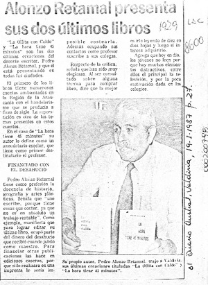 Alonzo Retamal presenta sus dos últimos libros [artículo]. El Diario Austral (Valdivia). -- ene. 19, 1987, p. 27 retr. .