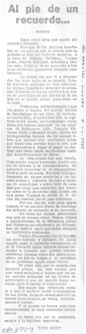Al pie de un recuerdo -- [artículo] / Tito Mudt. El Heraldo (Linares, Chile)-- jul. 5, 1969. .