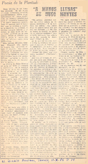 A manos llenas" de Hugo Montes [artículo] / Iván Carrasco Nuñez. El Diario Austral (Temuco, Chile)-- oct. 11, 1975, p. 14. .