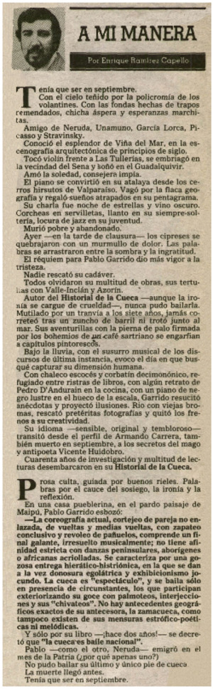 A mi manera [artículo] / Enrique Ramírez Capello. Las Últimas Noticias (Diario : Santiago, Chile)-- sept. 16, 1982, p. 32. retr. .