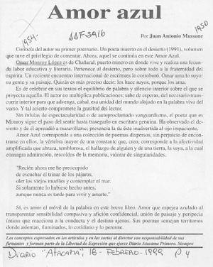 Amor azul [artículo] / Juan Antonio Massone. Atacama. -- feb. 18, 1999, p. 4. .
