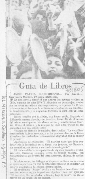 Amor, patria, sufrimiento. [artículo] El Mercurio (Diario : Santiago, Chile)-- oct. 6, 1974, p. 5. .