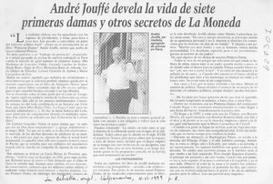 André Jouffé devela la vida de siete primeras damas y otros secretos de La Moneda [artículo] La Estrella (Valparaíso) jun. 4, 1999, p. 8 (suplemento) retr. .