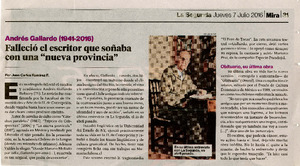 Andrés Gallardo (1941-2016) falleció el escritor que soñaba con una "nueva provincia"/ [artículo] : Juan Carlos Ramírez; [fotografía por] César Silva. La Segunda (Diario : Santiago, Chile)-- jul. 7, 2016, p. 31. .
