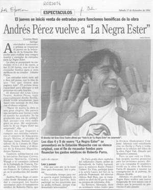 Andrés Pérez vuelve a la Negra Ester [artículo] / Claudia Heiss. La Epoca. -- dic. 17, 1994, p. 32 retr. .