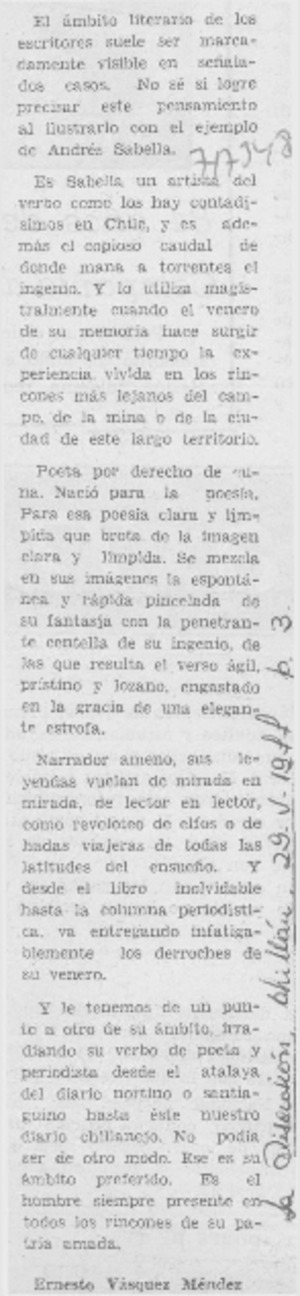 Andrés Sabella [artículo] / Ernesto Vásquez Méndez. La Discusión (Chillán, Chile)-- mayo 29, 1977, p. 3. .