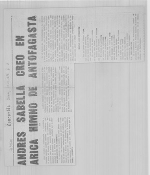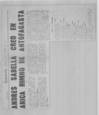 Andrés Sabella creó en Arica himno de Antofagasta. [artículo] Concordia (Arica, Chile)-- jun. 21, 1976, p. 3. .