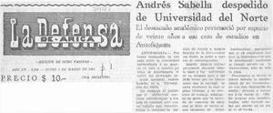 Andrés Sabella despedido de Universidad del Norte. [artículo] La Defensa (Arica, Chile)-- mar. 2, 1981, p. 1. .