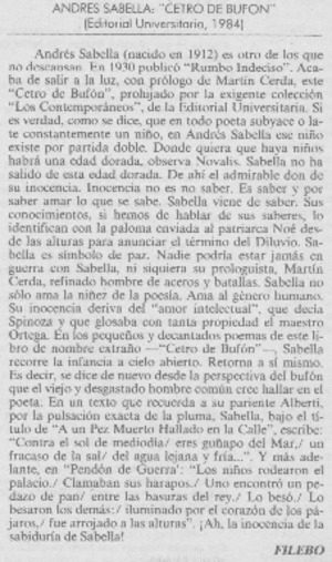 Andrés Sabella: "Cetro de bufón" [artículo] / Filebo. Las Últimas Noticias (Diario : Santiago, Chile)-- nov. 4, 1984, p. 15. .