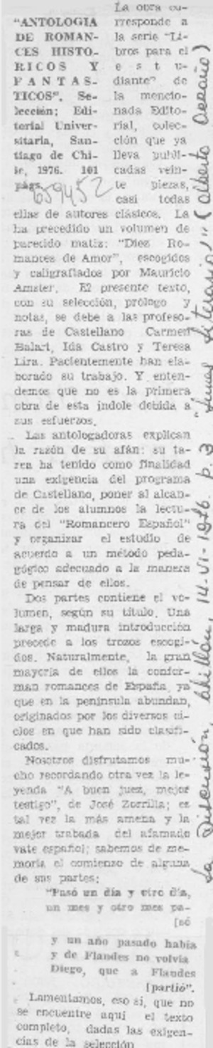 Antología de romances históricos y fantásticos [artículo] / Alberto Arraño Acevedo. La Discusión (Chillán, Chile)-- jun. 14, 1976, p. 3. .