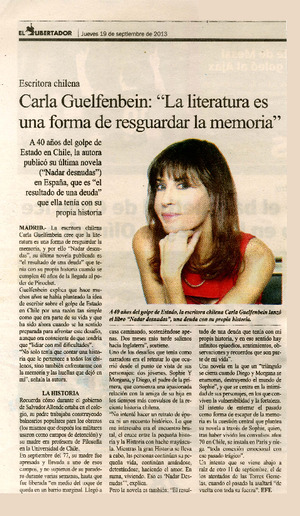 Carla Guelfenbein: "La literatura es una forma de resguardar la memoria" [artículo] / El Libertador (Diario : Rancagüa, Chile)-- sep. 19, 2013, p. 23 .