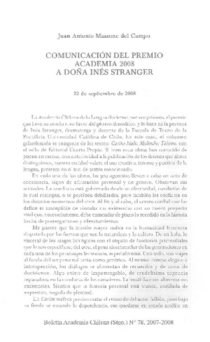 Comunicación del Premio Academia 2008 a doña Inés Stranger [artículo] / Juan Antonio Massone del Campo. Boletín Academia Chilena (revista : Santiago, Chile)-- no. 78 (2007-2008) p. 555-556. .