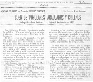 Cuentos populares araucanos y chilenos [artículo] / Antonio Cárdenas. La Prensa (Curicó, Chile)-- mayo 17, 1975, p. 3. .