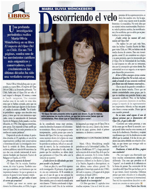 Descorriendo el velo : [entrevistas] [artículo] / Delia Pizarro San Martín. Ercilla (Revista : Santiago, Chile)-- no. 3222 (ago. 18, 2003) p. 78. retr. .