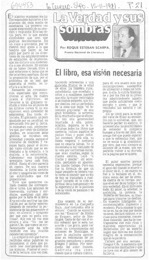 El libro, esa visión necesaria [artículo] / Roque Esteban Scarpa. La Tercera (Diario : Santiago, Chile)-- feb. 15, 1981, p. 21. retr. .