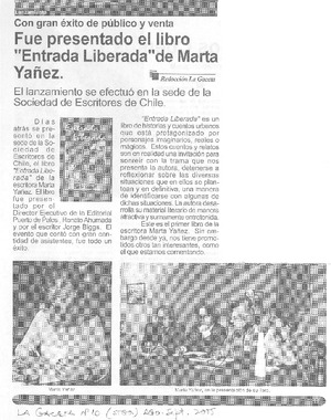 Fue presentado el libro "Entrada liberada" de Marta Yañez [artículo] La Gaceta (Revista : Chile)-- no. 10 (ago. sept. 2005) p. 17. .