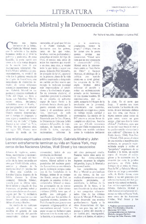 Gabriela Mistral y la Democracia Cristiana [artículo] / Richard Astudillo. Tribuna pública (Melipilla, Chile)-- (abr. 2007) p. 7. .