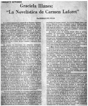 Graciela Illanes: "La novelística de Carmen Laforet" [artículo] / Hernán del Solar. El Mercurio (Diario : Santiago, Chile)-- ene. 23, 1972, p. 4. .