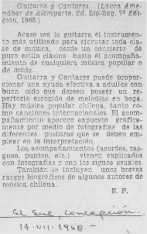 Guitarra y cantares [artículo] / E. P. El Sur (diario : Concepción, Chile)-- jul. 14, 1968. .