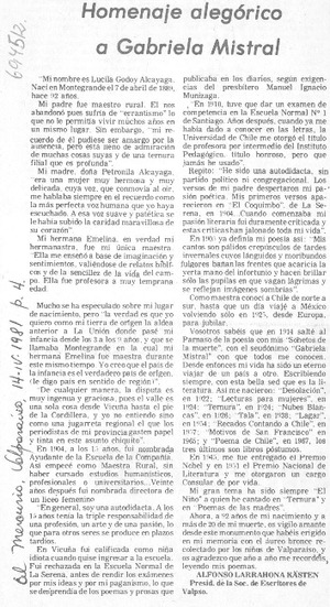 Homenaje alegórico a Gabriela Mistral [artículo] Alfonso Larrahona Kästen.