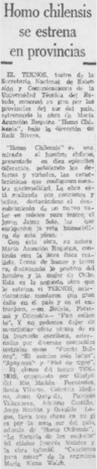 Homo chilensis se estrena en provincias. [artículo] Ultima Hora (Santiago, Chile)-- jun. 27, 1972, p. 19. .