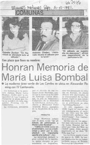 Honran memoria de María Luisa Bombal. [artículo] Las Últimas Noticias (Diario : Santiago, Chile)-- nov. 14, 1981. .