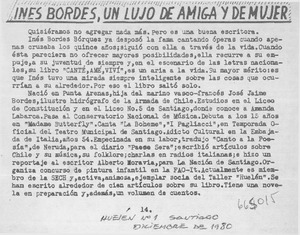 Inés Bordes, un lujo de amiga y de mujer. [artículo] Huelén (Santiago, Chile)-- no. 1 (dic. 1980) p. 14. .