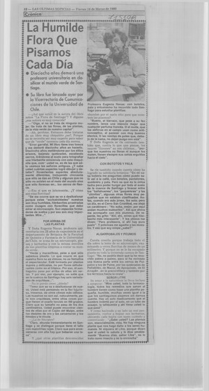 La humilde flora que pisamos cada día: [entrevista] [artículo] Las Últimas Noticias (Diario : Santiago, Chile)-- mar. 14, 1980, p. 12. retr. .