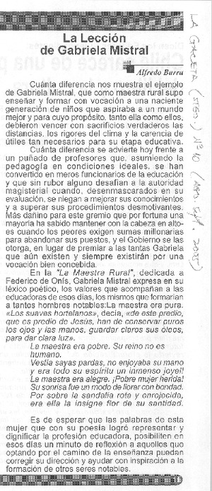 La lección de Gabriela Mistral [artículo] / Alfredo Barra La Gaceta (Revista : Chile)-- no. 10 (ago. sept. 2005) p. 11 .