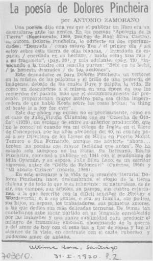 La poesía de Dolores Pincheira [artículo] / Antonio Zamorano. Noticias de Ultima Hora (Santiago, Chile)-- ene. 31, 1970, p. 2. .