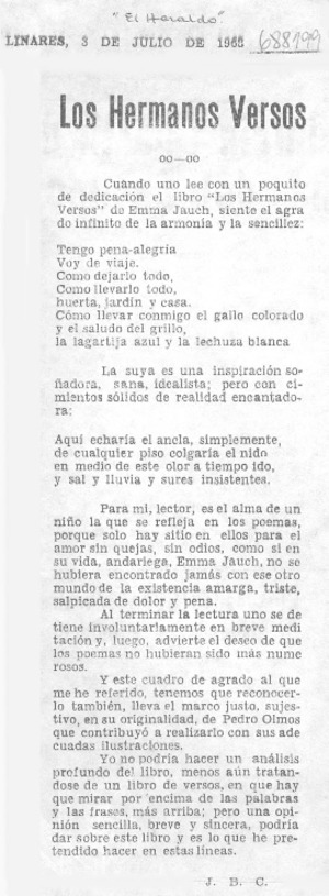 Los hermanos versos [artículo] / J.B.C. El Heraldo (Linares, Chile)-- jul. 3, 1968. .