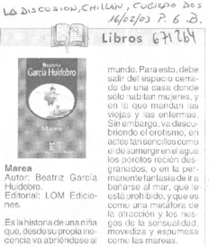 Marea. [artículo] La Discusión (Chillán, Chile)-- feb. 16, 2003, p. B6 (segundo cuerpo). il. .