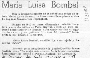 María Luisa Bombal [artículo] El Comercio (San Carlos, Chile)-- mayo 14, 1980, p. 3. .